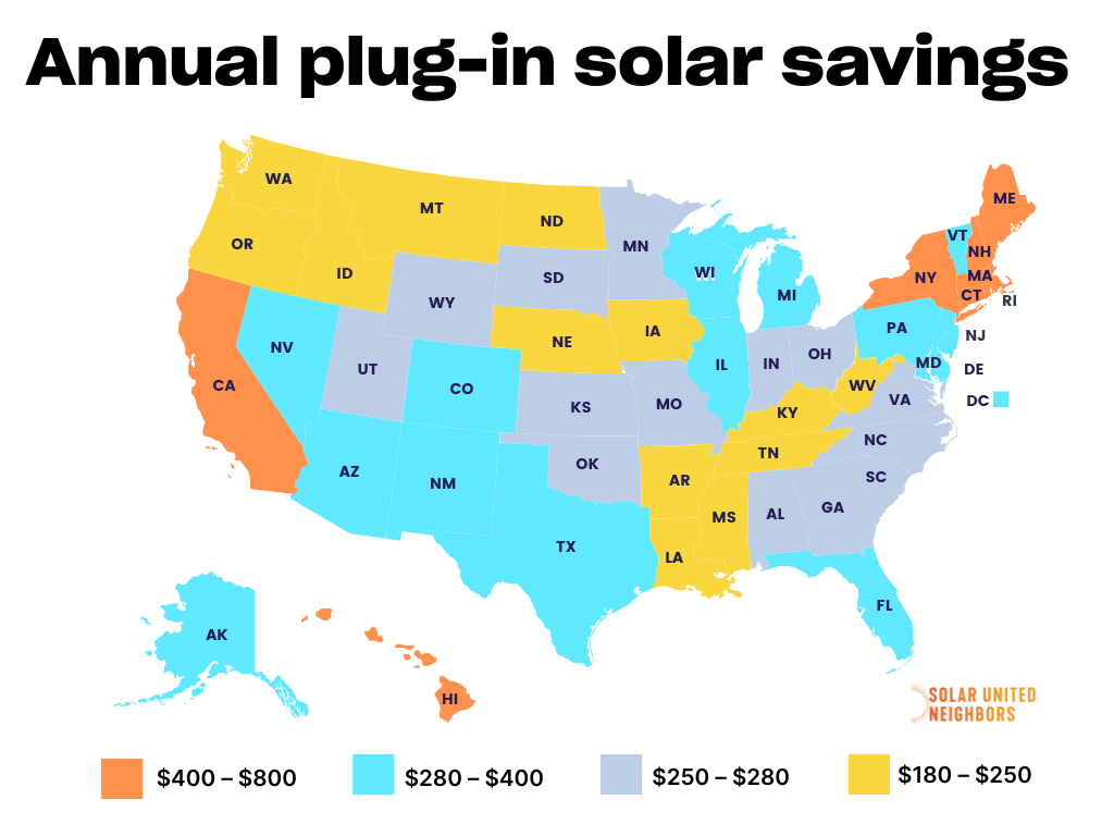 Plug-in solar, also called balcony solar, represents a significant shift in who can access solar energy. These factory-assembled systems (typically 400-1,200W) are designed to plug directly into standard electrical outlets through code-compliant connections. The technology has proven itself in Europe, whereGermany alone has deployed over 4 million units. For households in the U.S., these systems can reduce electricity consumption by up to 20%, translating to about$350 in annual savings. Solar United Neighbors developed astate-by-state savings mapshowing estimated annual savings ranging from $180 to $800 for a 1,200W plug-in solar system. 1