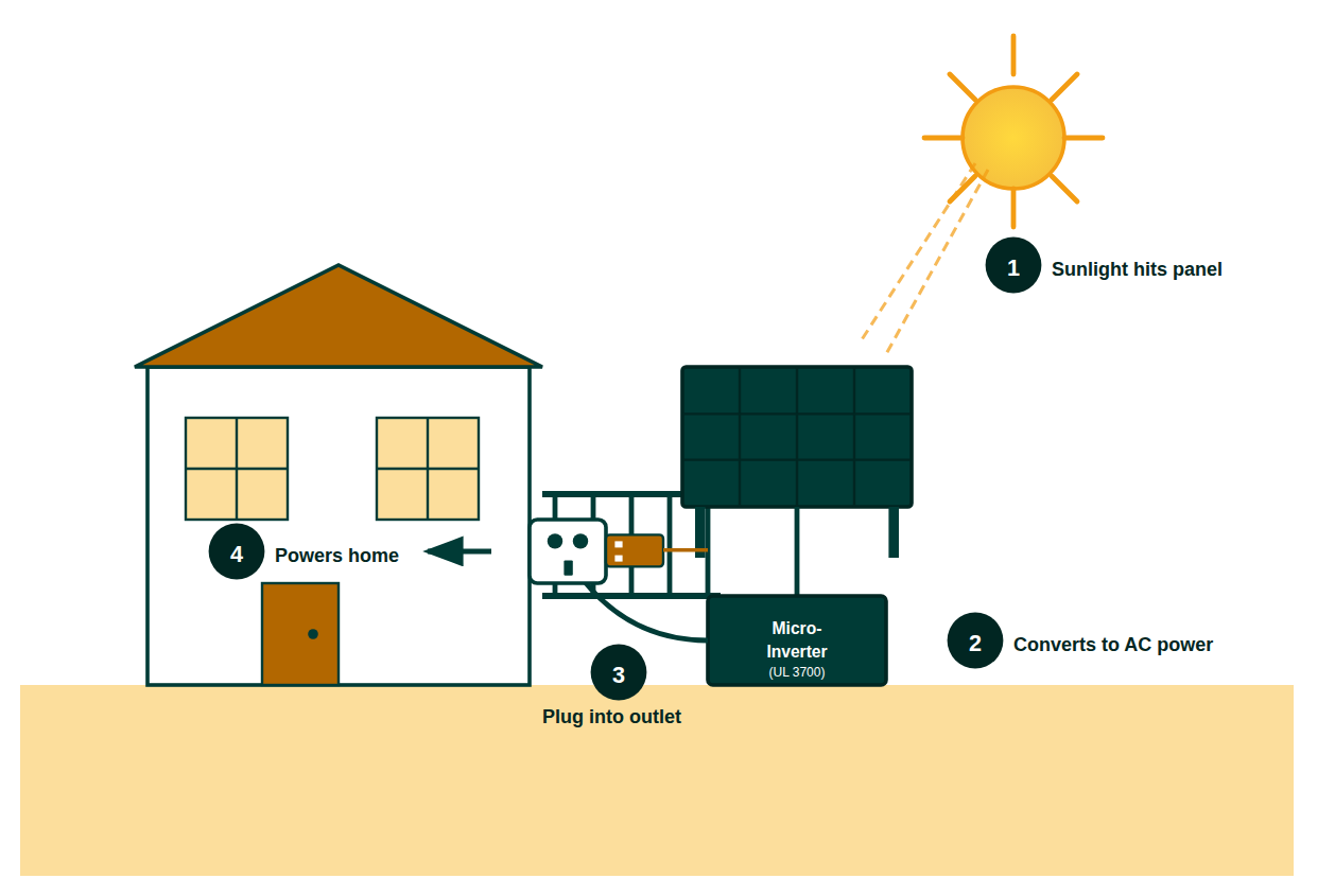 The solar panel produces DC power that flows directly to the built-in microinverter, which converts it to AC power – the standard type of electricity used in homes and compatible with all household appliances.