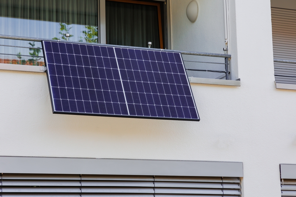 Compact panel (400-1,200W) mounted on a balcony or window captures solar energy.
