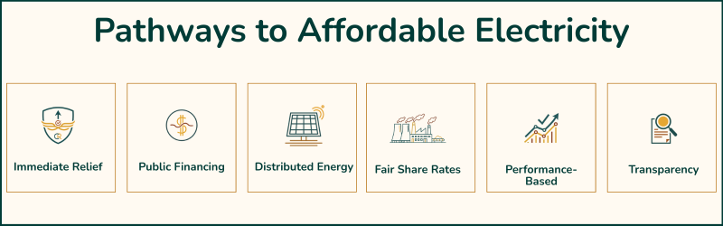 These are only some of the routes to greater affordability and improved reliability. A recent report from our friends at Just Solutions highlights many additional possibilities, from interconnection reform to locally-owned power to home electrification. Achieving electric utility accountability and affordability will require efforts on multiple fronts. Rigorous research, strategic organizing and focused advocacy all have a role to play in shaping the political will to transform the status quo and ensure universal access to affordable, resilient, renewable energy.